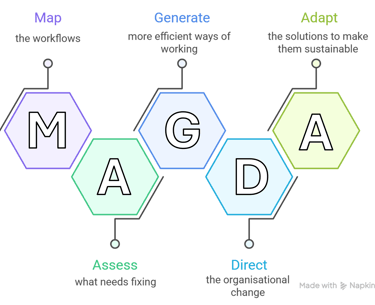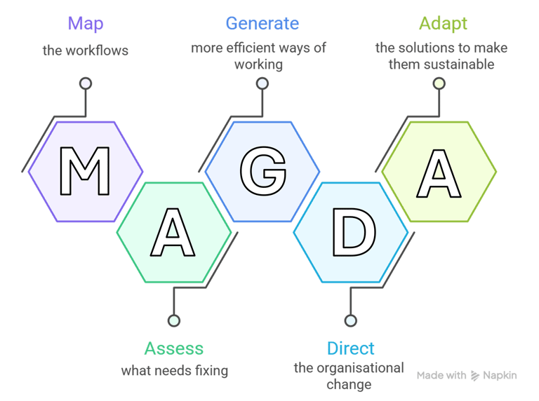 MAGDA is a simple and cost-effective process improvement framework that identifies and removes operational frictions in as little as 6-12 weeks, releasing 3-5 hours per employee per week for meaningful work.